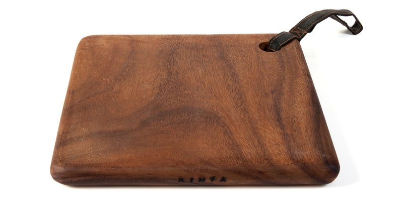 Een stoere snijplank van acaciahout met een rubberen hengsel uit de Filippijnen. Schoonmaken met lauw water met een beetje zeep. Acacia kan niet in de vaatwasser. Afmeting: 25 x 25 cm.
