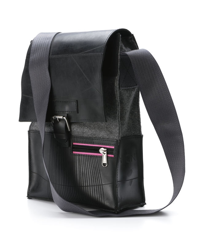 Schoudertas 'Tyre' is gemaakt van gerecyclede autobanden. De tas heeft een vakje aan de voorzijde met een knal roze accent. De schouderband is gemaakt van een veiligheidsgordel. Afmetingen: 8 x 21 x 30 cm.