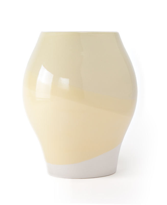 Deze vaas is erg bijzonder vanwege het kleur verloop. Waarom? Je kan keramiek niet meer dan twee keer in glazuur dompelen. Maar Thaise pottenbakkers kunnen goochelen met glazuur. Ze kunnen de derde kleuren creëren door de vaas onder te dompelen in twee kleuren. Daar waar de kleuren overlappen ontstaat een derde kleur. De vaas maakt deel uit van een serie vazen, schalen en kandelaars. Afmeting 30,5 cm hoog.