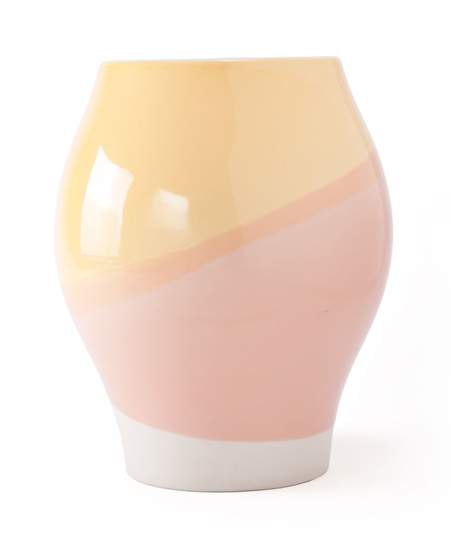 Deze vaas is erg bijzonder vanwege het kleur verloop. Waarom? Je kan keramiek niet meer dan twee keer in glazuur dompelen. Maar Thaise pottenbakkers kunnen goochelen met glazuur. Ze kunnen de derde kleuren creëren door de vaas onder te dompelen in twee kleuren. Daar waar de kleuren overlappen ontstaat een derde kleur. De vaas maakt deel uit van een serie vazen, schalen en kandelaars. Afmeting 30,5 cm hoog.