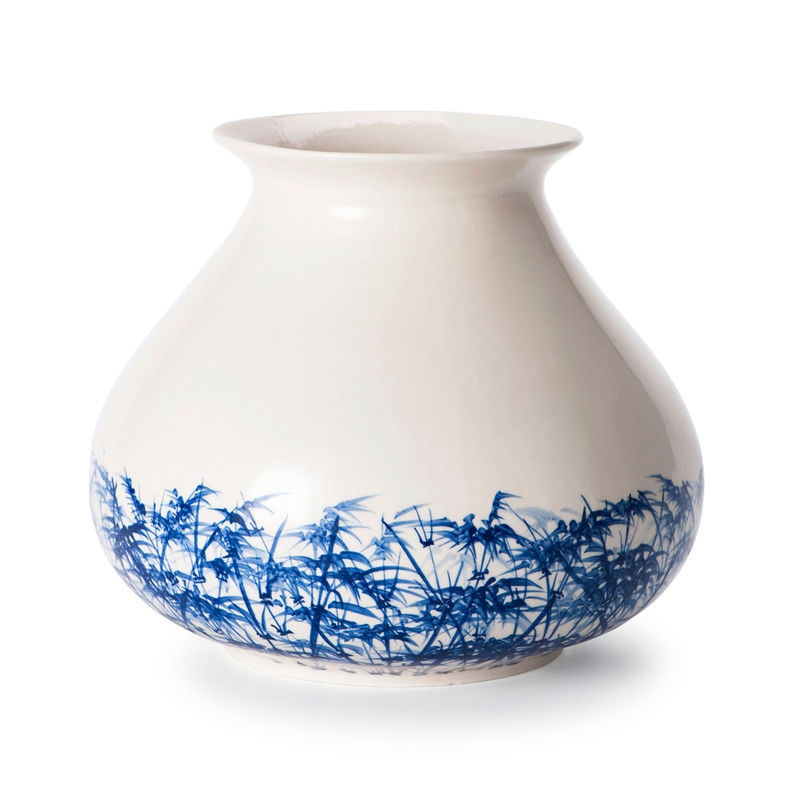 Samen met de pottenbakkers in Vietnam ontwierp Piet Hein Eek vazen die een moderne vorm combineren met traditionele Vietnamese kleuren en motieven. Piet Hein Eek vroeg aan hen om de kraanvogel- bloesem- en bamboemotieven net even anders toe te passen. Daardoor worden de decoraties ineens verrassend grafisch en modern. De vaas is waterdicht. Hoogte 20 cm, Ø 24 cm.