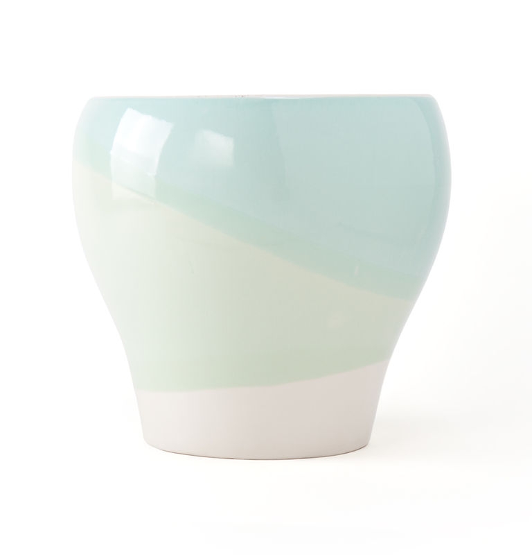 Deze vaas is erg bijzonder vanwege het kleur verloop. Waarom? Je kan keramiek niet meer dan twee keer in glazuur dompelen. Maar Thaise pottenbakkers kunnen goochelen met glazuur. Ze kunnen de derde kleuren creëren door de vaas onder te dompelen in twee kleuren. Daar waar de kleuren overlappen ontstaat een derde kleur. De vaas maakt deel uit van een serie vazen, schalen en kandelaars. Afmeting 19cm hoog.