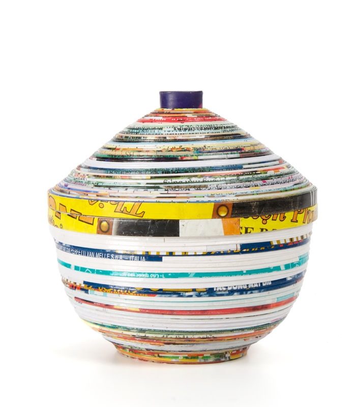 Deze ronde pot met deksel is gemaakt van kleurig gerecycled papier. Van afgekeurd papier worden lange stroken gemaakt, die vervolgens worden ondergedompeld in lijm. Behendig draaien de makers daarmee de gewenste vorm. De kom is 11cm x ø11,5cm.