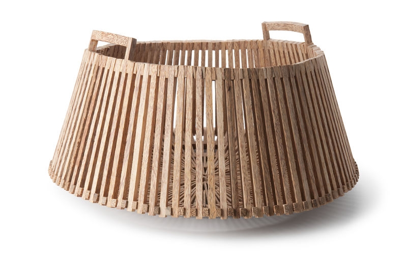 Voor de Vietnamese houtbewerkers is palmhout een mooie en snelgroeiende grondstof. Nadeel is dat het snel krom trekt. Met een speciaal ontwerp loste Piet Hein Eek dit probleem op. De manden en schalen zijn opgebouwd uit dunne aan elkaar geregen latjes. Deze kunnen krimpen en uitzetten wat ze willen - het product blijft intact. Voor sterke knopen en stevig draad vroegen de houtbewerkers advies aan de vissers in hun dorp. De mand is 31 cm x Ø 55 cm.