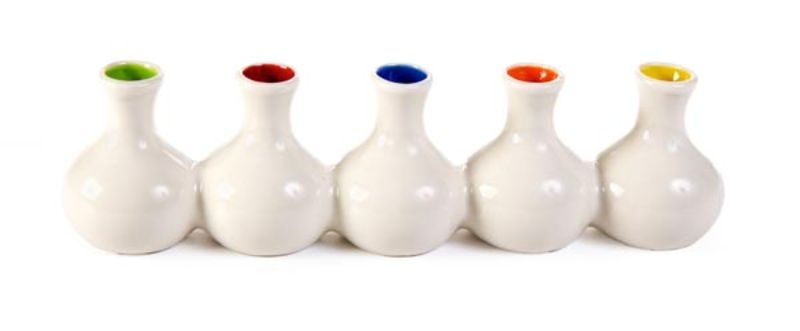 Vijf vaasjes gecombineerd tot één nieuwe vaas. De pottenbakkers brengen aan de binnenkant een laagje was aan en dompelen alles onder in wit. Het glazuur hecht dan niet aan de binnenkant. Daarna verwijderen ze de was en geven de vaasjes aan de binnenkant een kleur met een kwastje.