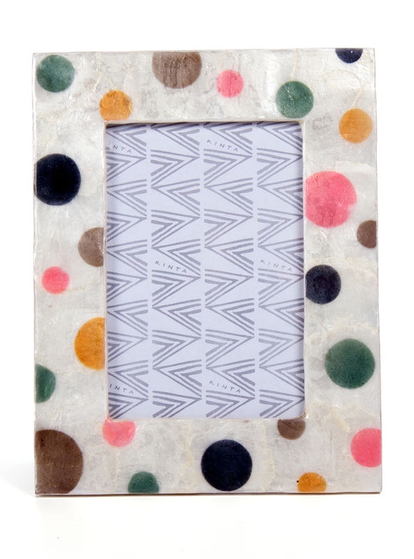 Een vrolijk fotolijstje met kleurige polka dots van capiz . Het verrassende van deze artikelen is dat de contouren van de schelp nog te zien zijn. Deze platte zeeschelpen zijn doorschijnend en komen uit de zeeën rond de Filippijnen en Indonesië. De schelp wordt volgens een papier-maché techniek verwerkt tot diverse artikelen. Transparante verf geeft de doorschijnende kleur en een niet-giftige hars zorgt voor versteviging. Afmeting: 15,5 x 20,5 cm.