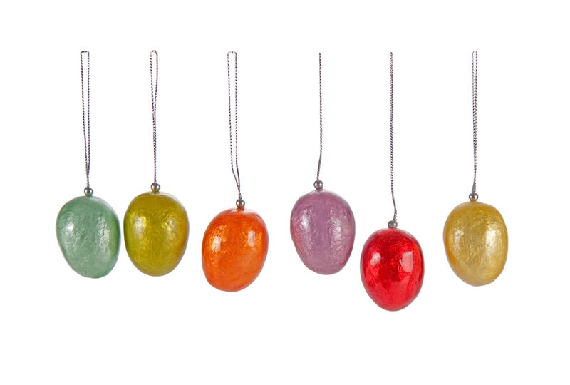 Set van zes gestipte Capiz eieren. Het verrassende van deze artikelen is dat de contouren van de schelp nog te zien zijn. Deze platte zeeschelpen zijn doorschijnend en komen uit de zeeën rond de Filippijnen en Indonesië. De schelp wordt volgens een papier-maché techniek verwerkt tot diverse artikelen. Transparante verf geeft de doorschijnende kleur en een niet-giftige hars zorgt voor versteviging. Afmeting 4 cm.